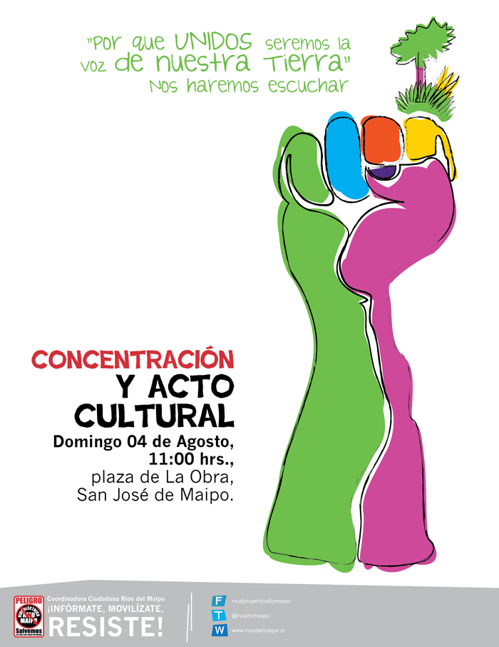 El domingo 4 de agosto a las 11 hrs los esperamos en la Plaza la Obra, San José de Maipo, en donde habrá una concentración y luego un acto cultural. Les adjunto 2 afiches para que los puedan difundir.