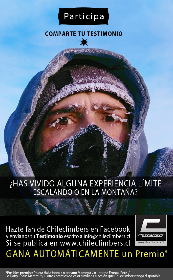 Hazte fan de Chileclimbers en Facebook y envíanos tu Testimonio escrito a info@chileclimbers.cl Si se publica en www.chileclimbers.cl GANA AUTOMÁTICAMENTE un Premio.