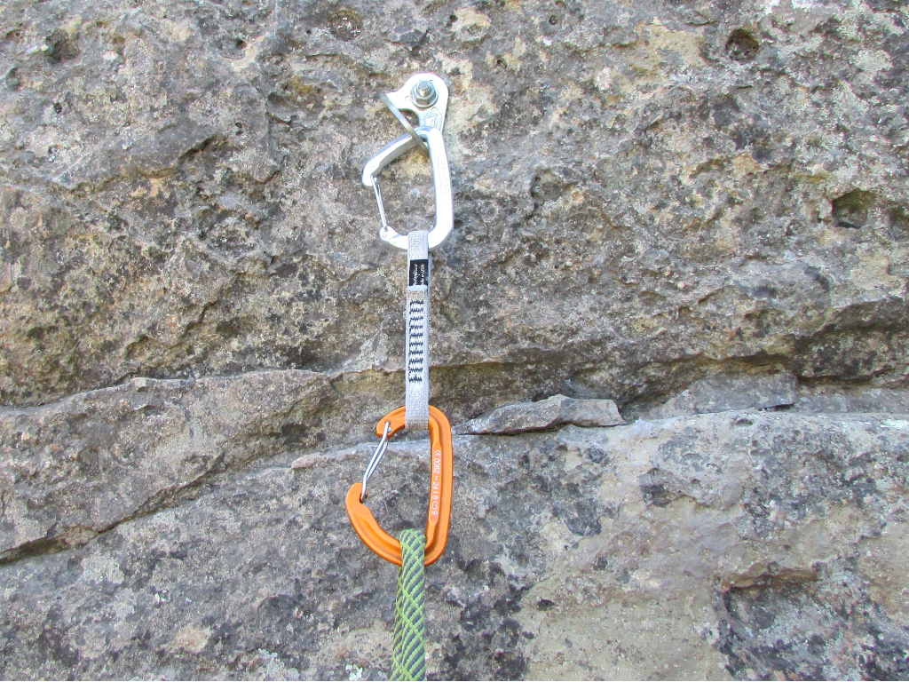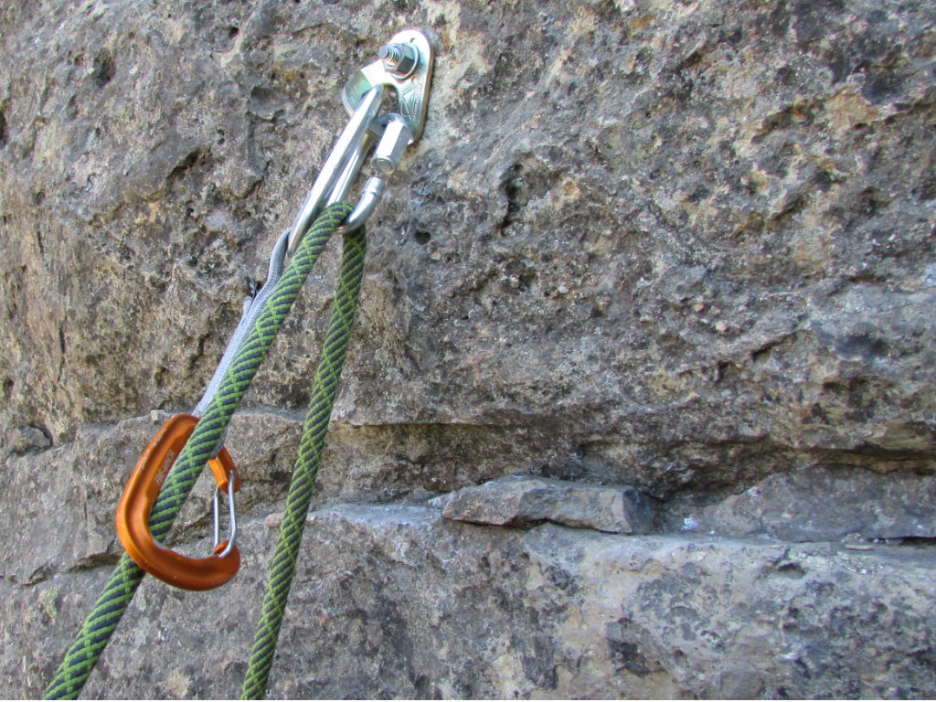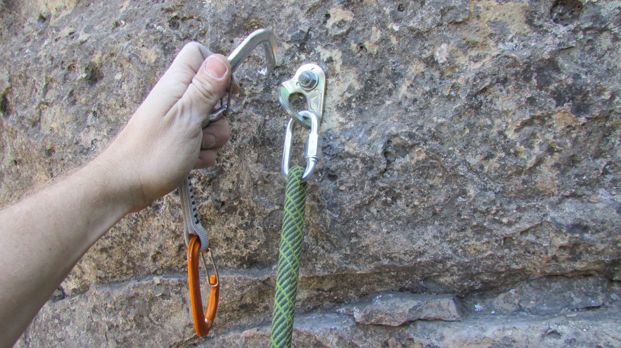 PASO 5: Al llegar a la siguiente cinta se debe volver a realizar el mismo proceso para redundar en la seguridad en caso de que fallase alguna chapa. Si no disponemos de otro maillón, podemos dejar un mosquetón sin seguro, o mejor aún, se pueden dejar dos mosquetones sin seguro «contrapeados» para mayor seguridad. Nuestra vida vale más que un par de mosquetones.