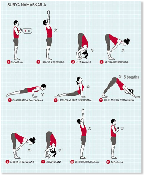 Dentro de estos tipos de yoga podemos encontrar muchos ejercicios que pueden apoyar nuestro entrenamiento de escalada y ayudarnos a focalizar nuestra mente mientras trabajamos nuestro cuerpo. Uno de los más básicos es la serie de Saludos al Sol en Vinyasa (imagen).