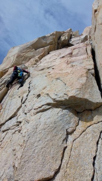 Acordándonos de lo conversado y visto desde campo base, nos enfocamos en la navegación, observando cada hito marcado en el mapa mental que llevamos presente. Cris goza de los primeros rayos de sol que nos toca absorber, después de haber tiritado toda la mañana. Otra travesía expuesta nos conecta con el sistema final de chimeneas y diedros. La escalada no deja de sorprender, y aunque protección abunda, la ruta se mantiene vertical y física.