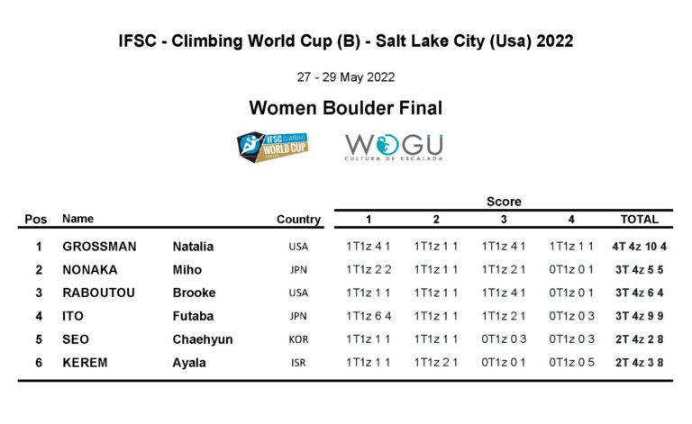 En el caso de mujeres, nuevamente tuvimos a una sólida Natalia Grossman quien, sin Janja Garnbret en el circuito, no tiene grandes contrincantes. Pese a que le tomó varios intentos, Natalia logró encadenar los cuatro problemas, para llevarse así el oro, siendo seguida por Nonaka Miho en el 2do, y Brooke Raboteau en el 3ero.