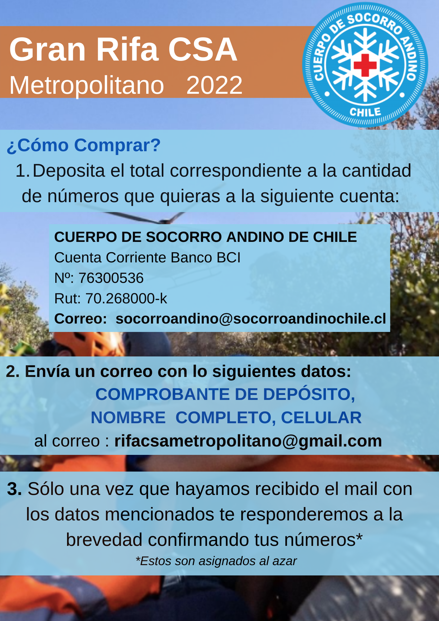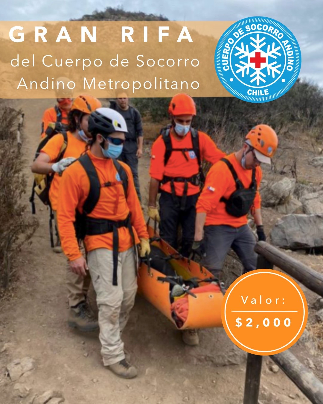 El creciente interés de las personas en realizar actividades en la montaña en los últimos años ha traído como consecuencia un aumento en la cantidad de rescates ejecutados por el CSA Metropolitano, en donde a la fecha hemos realizado más de treinta operativos de búsqueda, localización y rescate en montaña, por lo que generar recursos económicos para poder renovar el equipamiento y seguir con las tareas básicas de mantención se ha vuelto una prioridad. En este contexto es que se desarrolla la “Gran Rifa del Cuerpo de Socorro Andino de Chile – Delegación Metropolitana” en la cual los fondos recaudados serán de vital importancia para seguir manteniendo la operación del CSA Delegación Metropolitana con el nivel de excelencia y profesionalismo que nos caracteriza.