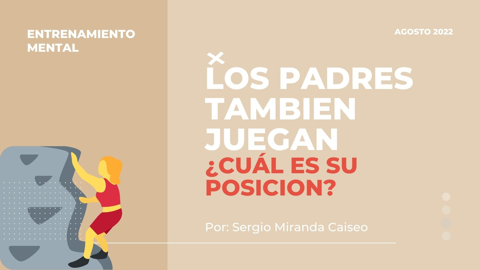 Los padres en el deporte también juegan, desde el ejemplo que dan (las investigaciones indican que los padres que realizan deporte tienen hijos que hacen deporte, en altas probabilidades), en relación con los recursos que deben poner a disposición (económicos, de tiempo -transporte, acompañamiento-, afectivo, etc.). Así como elementos de los que hay que cuidarse, sobre todo con la excesiva orientación al logro/éxito y el “vivir” a través de los hijos. Es su vida, su experiencia y su felicidad, no la nuestra.