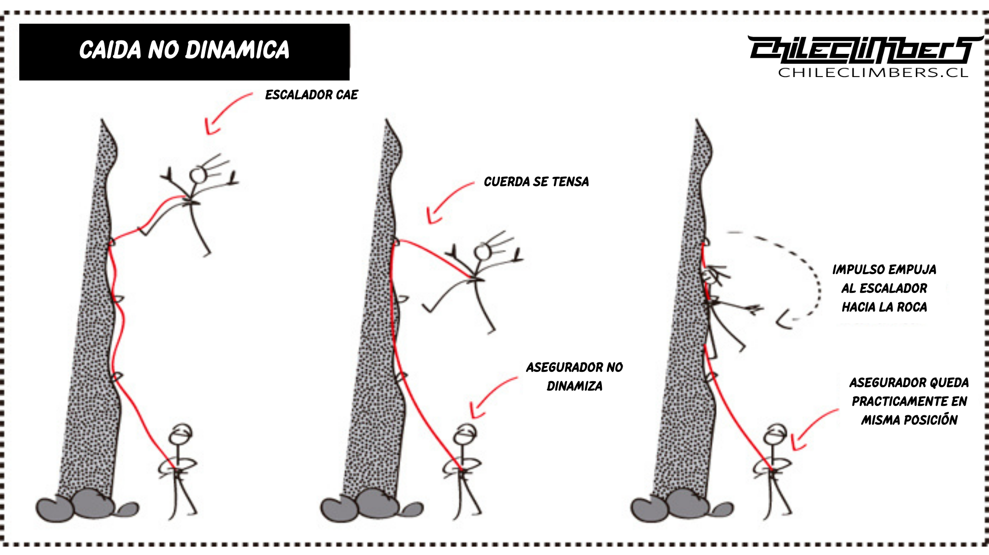 Para dinamizar la caída, el asegurador debe utilizar su peso corporal, siempre que sea equivalente o más pesado que el escalador, saltando suavemente. Si el asegurador es alrededor de unos 5 kilos más liviano, para evitar que la caída sea muy larga (y el riesgo de llegar a piso), simplemente hay que dejar que este te impulse hacia arriba una vez que se produce el tirón (sin saltar). Ahora, si el escalador es EXCESIVAMENTE más pesado, bueno, lo más recomendable es no asegurarlo (la cordada siempre debería tener un peso equivalente). O si no queda otra, en ese caso, no dinamizar y hacer el esfuerzo contrario, es decir, tirar el cuerpo hacia atrás, para evitar el impulso que te lleva hacia arriba. Como ven, todo DEPENDE de la situación. No hay una técnica exacta aplicable a todos los casos, de ahí el por qué la experiencia también es necesaria. Así que no se sientan mal cuando un mono apretón prefiere que lo asegure su cordada de siempre en una ruta complicada.