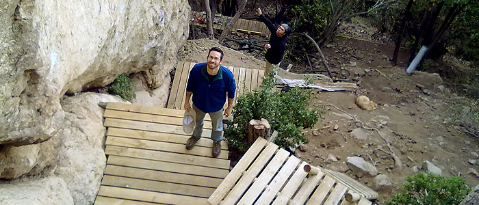 Hace cuatro años atrás aproximadamente hicimos unos pequeños trabajos de modo de evitar un poco la erosión que producimos como escaladores, sin embargo con el paso del tiempo no fue suficiente y esta vez decidimos realizar algo más permanente. El objetivo principal fue delimitar las zonas por donde se transita y construir plataformas cómodas para asegurar y escalar en el sector Popeye, de modo que sea preferible estar en estas superficies que en las zonas erosionadas o sobre las raíces de los árboles.