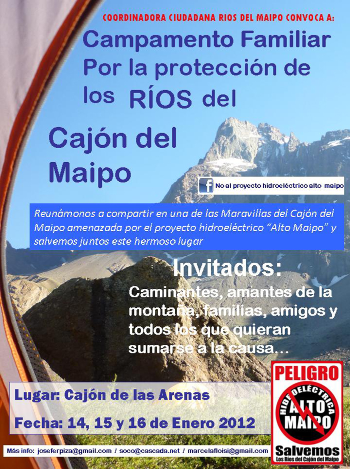 A los que quieren apoyar a la organización que está en contra de la construcción de la Central Alto del Maipo, les comentamos que este fin de semana (sábado y domingo) se realizará una actividad a la cual están todos invitados para que vayan con sus amigos. En el afiche que les dejamos para que se motiven a asistir, están los contactos para más información (marcelafloisi@gmail.com, soco@cascada.net, joseferpiza@gmail.com)