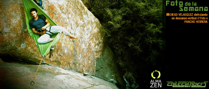 En una dura jornada de escalada, una siestecita no viene mal, sobre todo en un lugar como Chacabuco, donde los calores veraniegos hacen inevitable el sueño pos-almuerzo. Por esto Diego «Moke» Velásquez venía preparado con hamaca y todo, para poder disfrutar un descanso vertical, rodeado del paisaje de esta cuesta que se encuentra camino a Los Andes. Inspirado por la paz que transmitía este cabro, Pancho Herrera no dudó en tomar la foto.