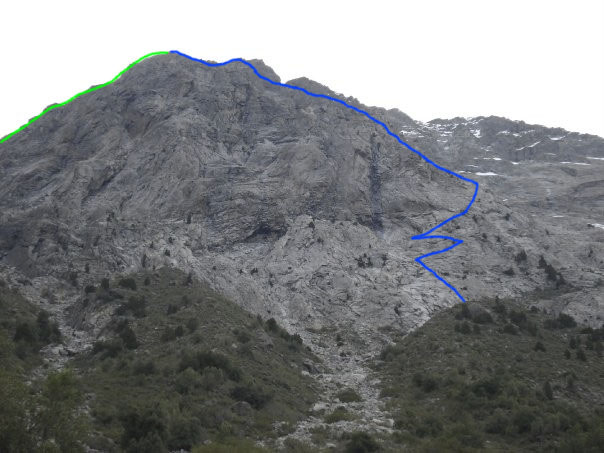 -Se baja por un pésimo acarreo con desescaladas de hasta 5.8 unos doscientos metros, para luego encontrar un pequeño portezuelo en el cual armamos una torre de rocas para indicar la correcta dirección de la bajada. Luego se continúa bajando en destrepas 5.8 delicadas hasta llegar al acarreo que conecta con Colombianos.