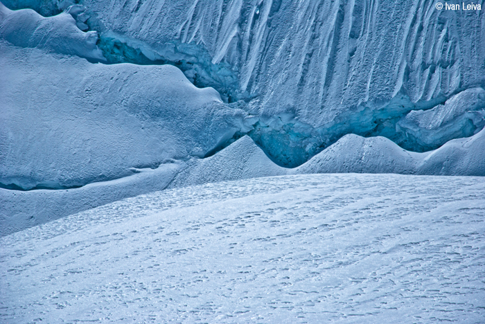 La primera dificultad fue cruzar la rimaya, ya que esta tenía mucha nieve blanda lo que hacia difícil la prtección, las estacas de nieve eran más bien para tranquilizar la “sicológica” y después de esto vendría una sección de hielo cristalino duro de 90° a 95°. Finalizada esa parte, accedimos a la canaleta por donde va la ruta. Una vez superando los primeros dos largos, viene uno de escalada en nieve dura, donde la protección es sólo con estacas hasta una transición de nieve dura a hielo al siguiente largo. Los siguientes son de hielo con pendiente de 70° a 80° aprox.