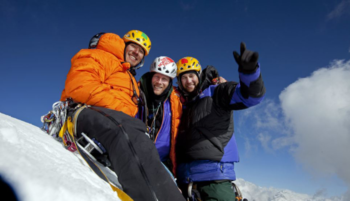 Jimmy Chin, Conrad Anker and Renan Ozturk celebran en la cumbre su ascenso de la vía Shark’s Fin después de 11 días escalando en el monte Meru, India-