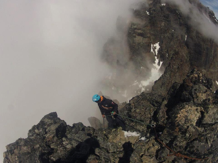 La aventura comenzó una vez internados en la evidente chimenea, a la cual nos enfrentamos, con pasadas verticales y roca de pésima calidad, donde el más mínimo error podría tener consecuencias desfavorables. Luego de superar 120 mts. de dicha sección, la cual la bautizamos “Acarreo vertical”, puesto que no entendíamos como una roca de tan mala calidad podía sostenerse de manera vertical. Posteriormente realizamos un pequeño traverse, de no más de 100 metros, encontrándonos con una nueva pared, esta vez de buena calidad y bastante decente en comparación a la sección anterior, quedando a sólo 5 largos de la cumbre.