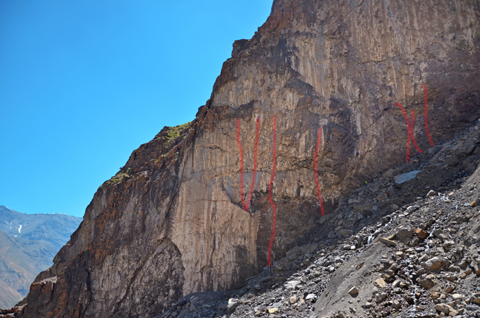 Dos de las cuatro rutas restantes están en el sector de las placas del primer piso, arriba de Los Rizos de la Rubia 5.12c/d, comenzando desde la terraza que corta esa pared. La primera abierta no tiene nombre hasta ahora y se mantiene como proyecto porque no ha sido encadenada, pero podría ser un 5.13c. Después se abrió Sodoma y Gomorra que podría ser un 5.12c/d con unos buenos «alejes» de cinta. La tercera abierta en este sector es Puro jugo en la Pared, la que se ubica más a la derecha. Esta ruta es de dos largos: el primero, es una placa con movimientos muy técnicos, que podría ser un 5.12d y el segundo largo no ha sido probado, pero se ve duro.