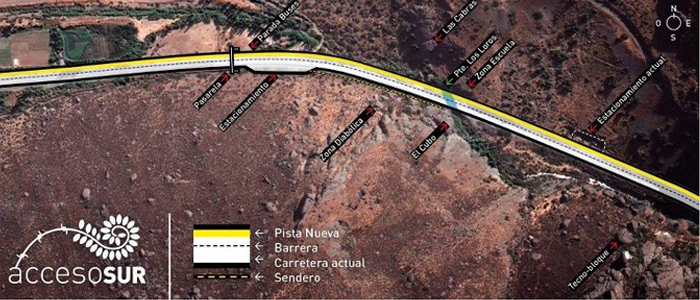 – Junto con agregarse una pista se va a disminuir la pendiente de la cuesta, por lo que la autopista “sube” un par de metros desde antes de la zona de escalada hasta unos 300m después del puente Los Loros. Si bien esto elimina los estacionamientos actuales, el proyecto considera una zona de estacionamientos aproximadamente 200m después del puente en el lado sur y un sendero que llega hasta el puente.