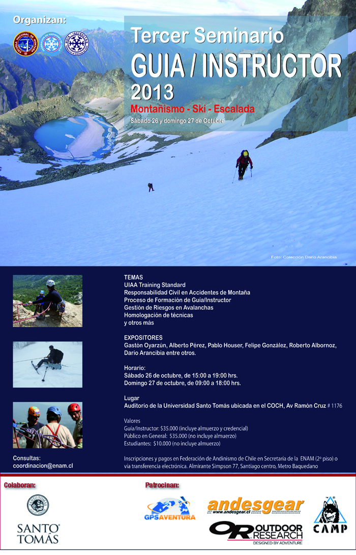La Dirección Técnica de la Escuela Nacional de Montaña (DT-ENAM), perteneciente a la Federación de Andinismo de Chile (FEACH), desarrollarán, este fin de semana, el tercer Seminario Guía/Instructor, donde se expondrán temas relacionados con la actividad profesional de las disciplinas de montañismo, la escalada y el ski de montaña.