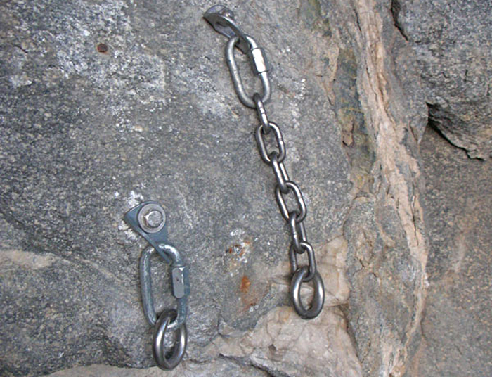 Estaba probando una de esas rutas fáciles, no más de un 5,8, sin embargo producto de la falta de escalada, iba aterrado para arriba y lo único que quería era llegar a las cadenas para bajar. Eran esos tiempos en que me decía «¡para qué hago esto, si la paso tan re mal!». La cosa es que llegué al top de la vía y sorpresa, ¡no habían cadenas! Sólo había un mailllon, pero el más, más, de juguete que existe… ese que es bien delgadito. Y en la otra chapa, un cordín dudooooooooso. Así que producto de la falta de conocimiento que tenía en esos tiempos, decidí pasar la cuerda por el maillon marca “Otto Krauss” y directamente por la otra chapa que quedaba. Me bajaron sin problemas, y cuando llegué abajo le dije a mi asegurador: «¿oye; está bien pasar la cuerda por la chapa cuando no hay cadenas?» Y me mira con cara de enfurecido (era su cuerda) «¡¡¡tai loco weon, te podrías haber matado!!!» NUNCA, pero NUNCA, hay que pasar la cuerda por una chapa, ya que esta se puede cortar con el canto de la chapa, por último es preferible dejar un mosquetón, pero nunca la cuerda de forma directa. Menos mal el maillon estaba un poco más arriba de la chapa, por lo que la mayoría de la fuerza recayó en éste y la fuerza fue menor en la chapa.