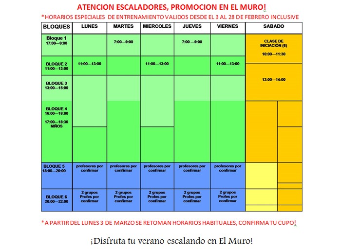 Durante todo el mes de Febrero, Gimnasio el Muro ofrece a los escaladores precios súper rebajados en horario económico, para quienes se quedan en la capital y quieren seguir entrenando o disfrutando su escalada con los amigos.