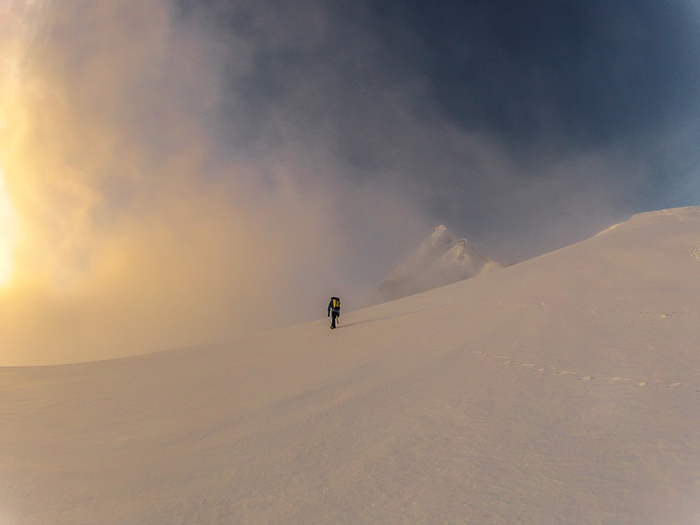 Nos pusimos crampones, sacamos los piolet, armamos la mochila de ataque, sacamos la cuerda y para arriba! Sabíamos que el tiempo estaba un poco inestable por lo que fuimos lo más rápido posible para poder alcanzar la cumbre y bajar lo más rápido posible antes de que se tapara nuevamente. Así las cosas, fuimos tan concentrados y metidos en la escalda que sin darnos cuenta, llegamos a la cumbre, donde nos esperaba un viento bien helado. Ahí contemplamos la increíble vista que tiene esta cumbre por unos momentos, sacamos un par de fotos y para abajo!