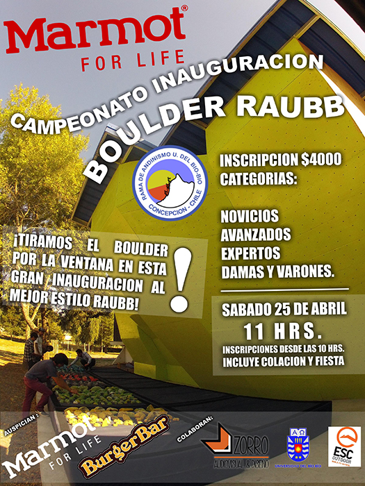El torneo, que celebra la inauguración de este nuevo boulder, se llevará a cabo a un costado del gimnasio de la Universidad del Bío Bío, en la ciudad de Concepción. Los fondos recaudados en el evento serán destinados a mejoras en la infraestructura del boulder, espacio que es de uso público de libre uso para la comunidad de escaladores de la octava región. Ya están avisados, sólo queda ¡motivarse y participar!