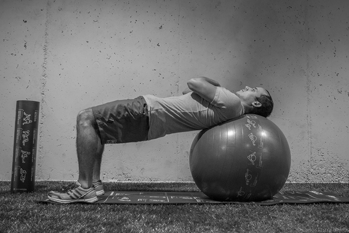 Puente supino con balón: Hombros, cuello y cabeza deben descansar sobre el balón, las rodillas deben mantener los 90 grados de flexión, los brazos van en el pecho para no disminuir la inestabilidad lateral del balón. Se debe contraer glúteo para mantener la pelvis elevada, controlar la flexión de rodilla con los isquiotibiales y llevar el ombligo a la columna durante todo el ejercicio.