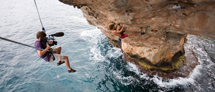 sharma camara «Es Pontas» es probablemente la via de Psicobloc mas mediatica que existe, y claro si es un 9a con una caida de 20 metros de altura no debe ser ningún chiste. Y su primer encadenador fue otro «Rock Star» de la escalada: Chris Sharma
