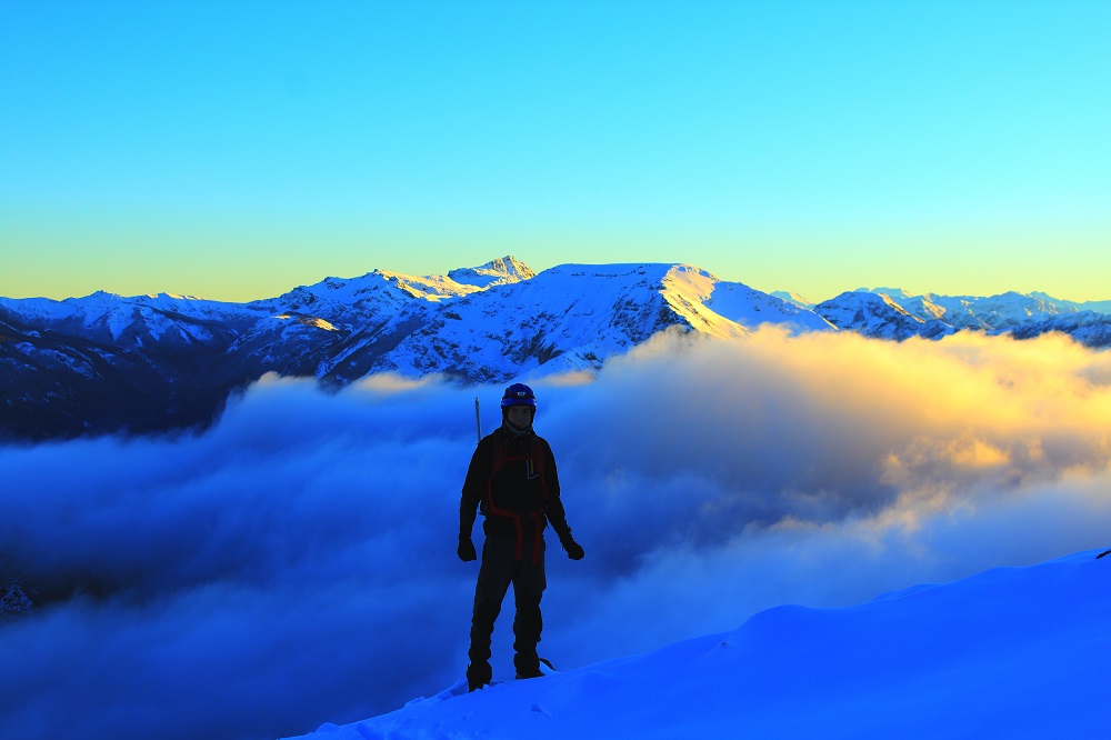 Roberto Pulido nos manda esta tremenda foto subiendo por la cara norte del Volcán Antuco, foto tomada en la madrugada, en el día de cumbre, donde podemos ver colores increíbles, con los rayos del sol reflejando las nubes sobre la laguna Laja.