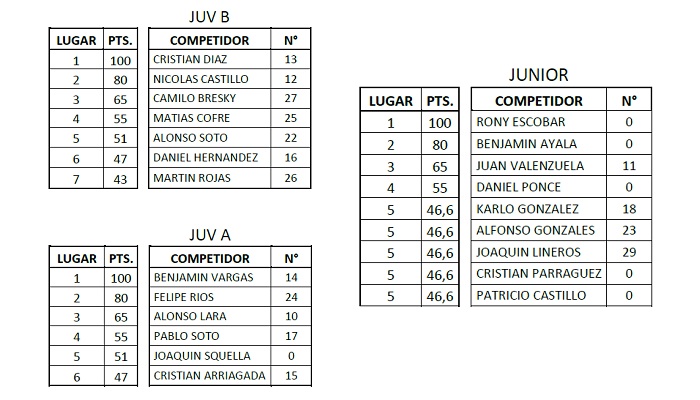 Para calcular el puntaje se ocupa la tabla publicada en el reglamento I.F.S.C. y se procede según el texto del mismo reglamento para dirimir empates. Los siguientes son los resultados generales de la competencia en cada una de las categorías propuestas.