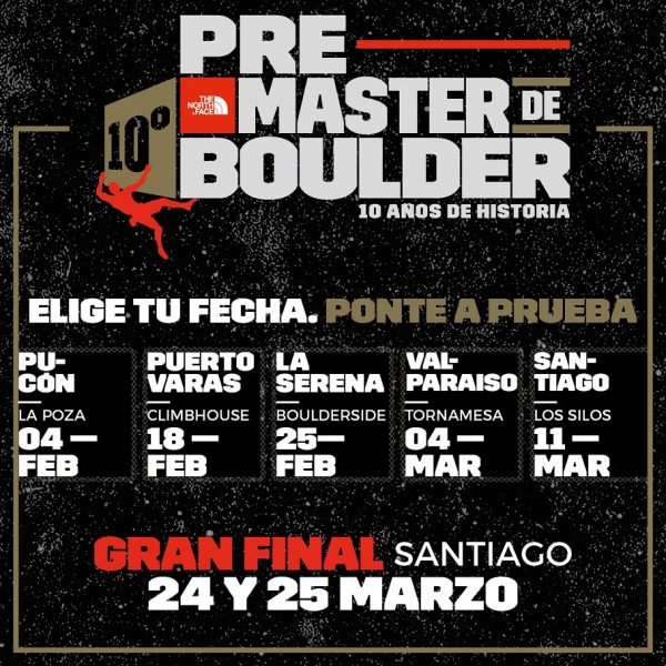 Junto con este increíble festival se desarrollará el día sábado 4 de febrero el primer The North FacePre Master de Boulder del 2017, que buscará a los mejores exponentes de la escalada de la novena región para ser parte The North FaceMaster de Boulder a desarrollarse en Santiago el mes de marzo. El Pre Master es abierto a todo público y no tiene límites de edad ni de experiencia en la escalada. Todos los que quieran competir deben inscribirse en www.welcu.com/thenorthface.