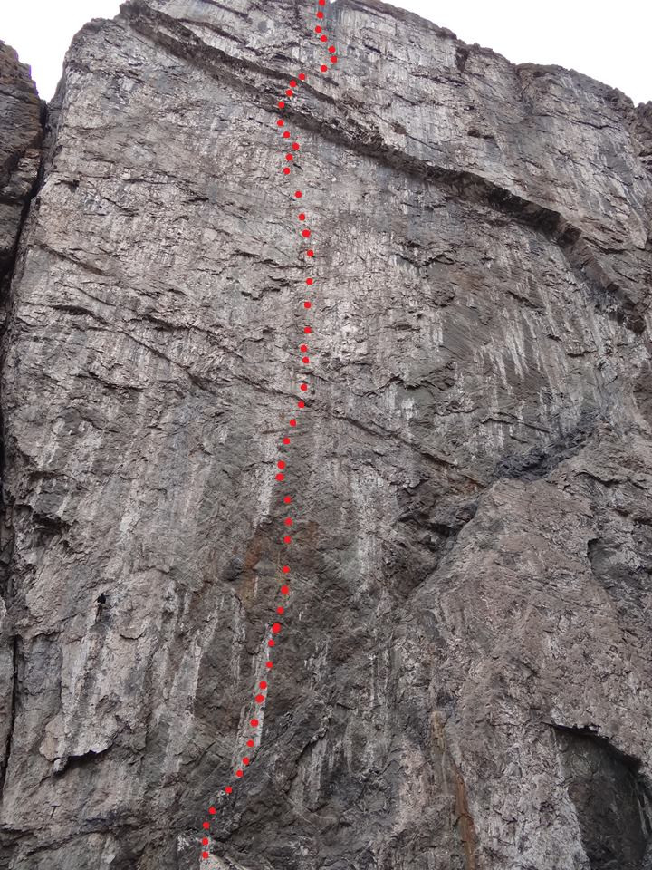 Para finalizar la vía, el último largo comienza con una escalada relativamente fácil hasta llegar al crux de la vía. Básicamente  una secuencia de resistencia en una pared completamente vertical con pequeñas regletas  que se extiende hasta el final del último largo.