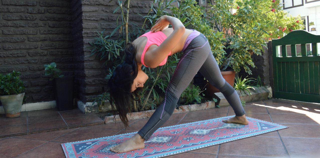 Liberamos nuestros brazos y volvemos a la asana del guerrero, con nuestra pierna izquierda en 90 grados. Exhalamos y llevamos nuestro tronco hacia la derecha, mientras formamos un ángulo recto con nuestro brazo izquierdo por detrás de nuestra espalda. Exhalamos y lentamente bajamos nuestro tronco, pasando nuestro brazo por delante de nuestra pierna y mirando a nuestra mano derecha en el aire. Relajamos nuestros hombros y mantenemos por otro minuto más.