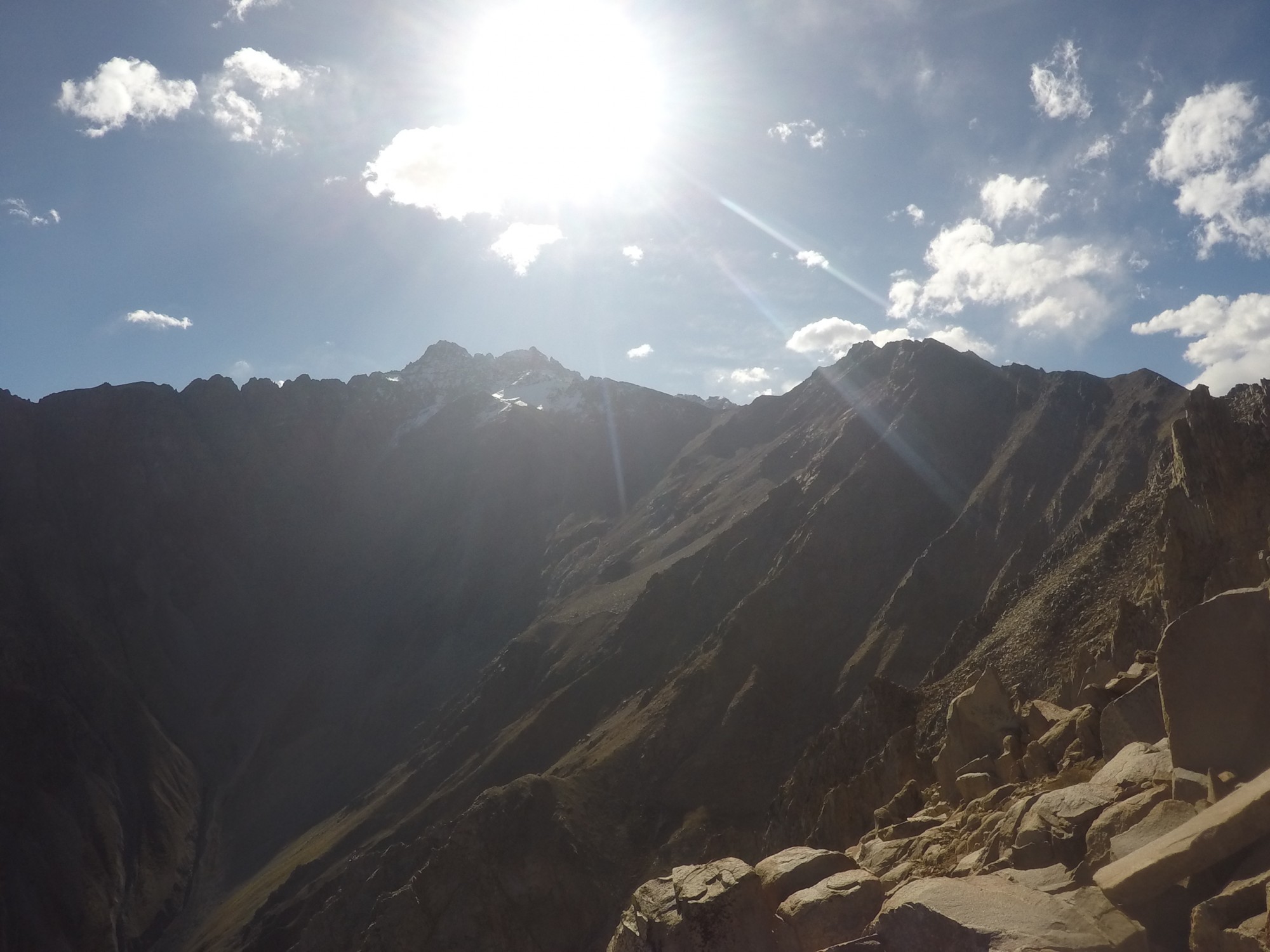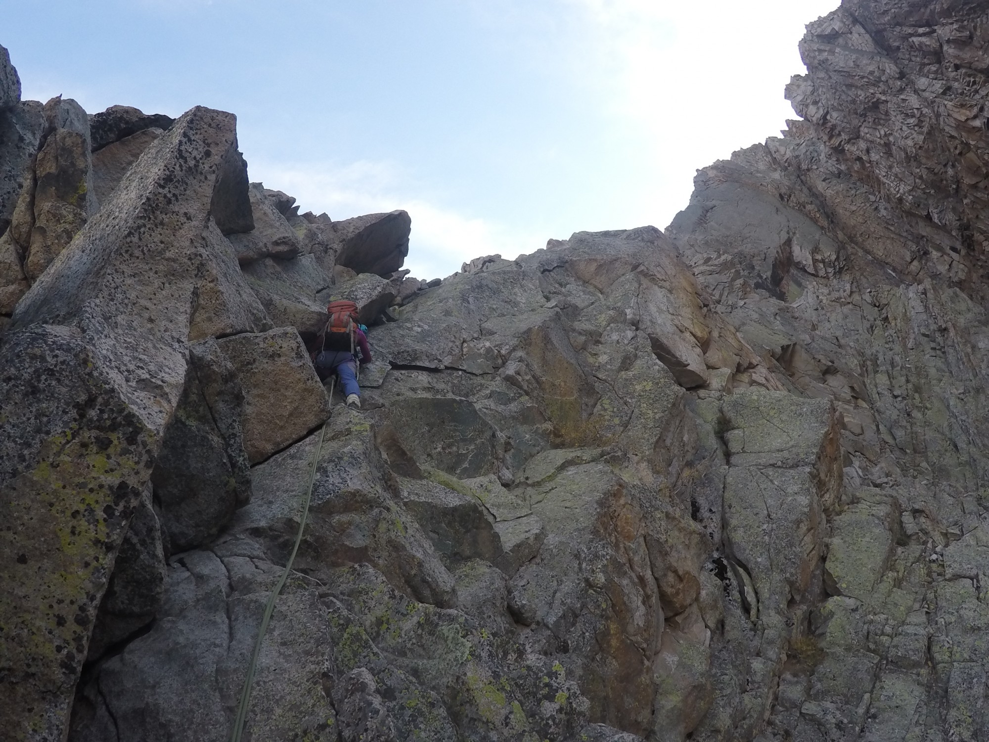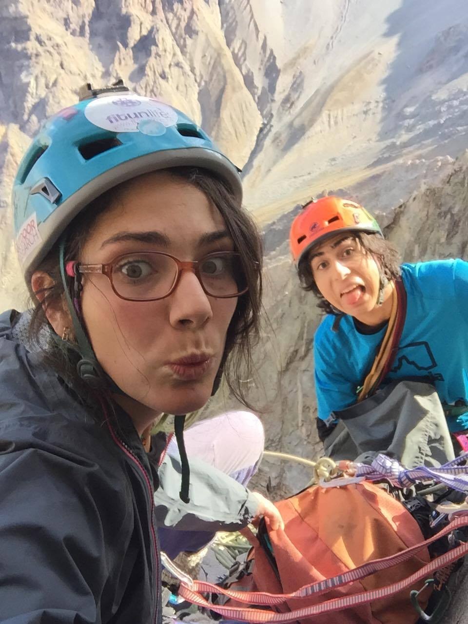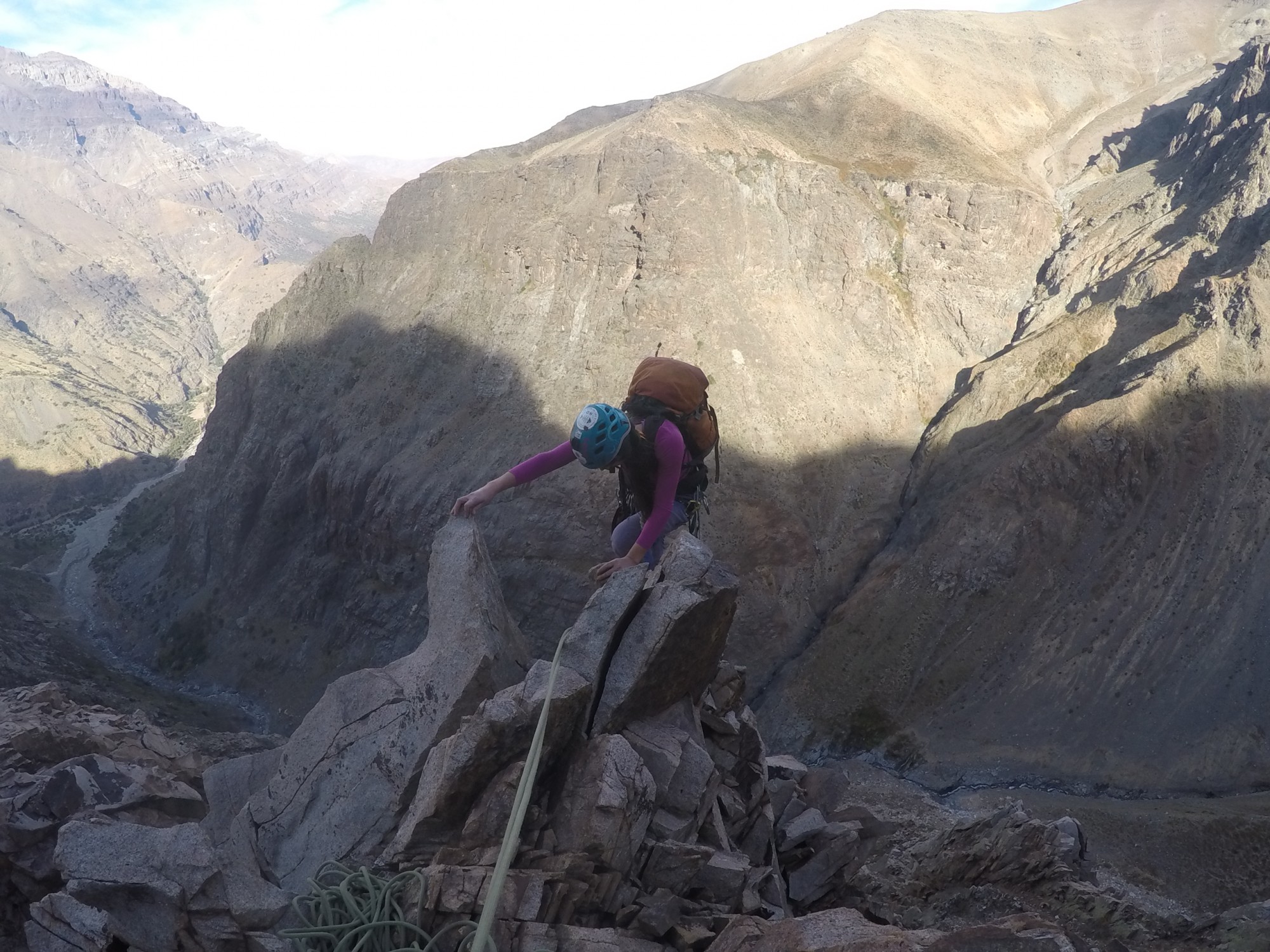 Tipo ocho de la mañana con el sol ya en nuestras narices, apreciamos al coloso que teníamos delante, una pared bastante grande (aprox. 800 metros) pero no muy vertical; nos equipamos y comenzamos con la escalada, debido a las condiciones que presentaba la pared decidimos ir desencordados y a veces en simultaneo…. así transcurrieron los primeros 600 metros, una interesante y sketchy trepindanga que pasaba por varios terrazones y a veces por un aéreo filo. Eran como las 12.30 y nos encontrábamos relativamente cerca de la cumbre en una agradable terraza, hasta el momento la ruta no había presentado muchas dificultades técnicas (de hecho habíamos escalado todo con las tillas de aprouch).