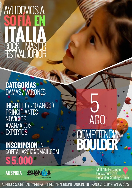 Se viene una nueva competencia en el muro Bhanga, con el fin de recaudar dinero para el nuevo desafío de la escaladora Sofía Rosenblut: competir en Italia en el Rock Master Festival Junior. Sofía es una niña de 9 años que ha demostrado un gran potencial en la escalada deportiva, con un entusiasmo, perseverancia y técnica que sin duda la llevará a lograr grandes objetivos como deportista nacional. Es por esto que los invitamos el 05 de Agosto de 2017 a participar en este gran evento, el cual tendrá rutas para 5 categorías de participantes, premios, stands de comida, música en vivo y más!