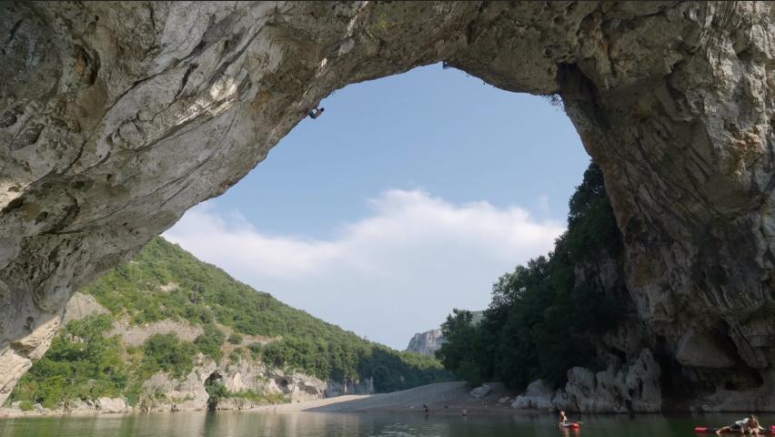 En este video podrán ver que las caídas son de bastante altura y el río no se ve muy grande, sin embargo es lo suficientemente profundo para crear una de las mejores escaladas en todo Europa en un ambiente único, acompañado de una hermosa naturaleza, el bello río y por supuesto este arco de roca calcaría que complementa el escenario.