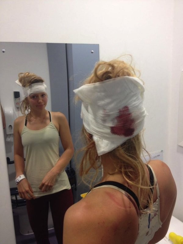 «La siguiente conversación es sobre los cascos. Si mi arnés me hubiera ceñido correctamente, no lo hubiera necesitado, pero no fue así y si hubiera llevado puesto un casco mis heridas no hubieran sido tan feas ni mucho menos. Para contextualizarlo, por mi experiencia, creo que más del 90% de escaladores deportivos no llevan casco. Yo era parte de ese 90%. Para la escalada tradicional, siempre llevo un casco y creo que esa es una distinción común entre muchos escaladores».