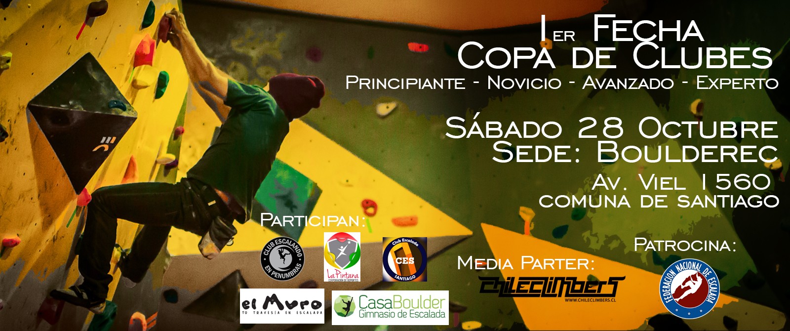 Se viene la primera fecha de la copa clubes 2017 el día Sábado 28 de Octubre en la sala de escalada Boulderec ubicada en Av. Viel 1560 en la comuna de Santiago.
