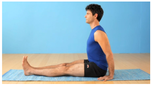 1.- Siéntate en el suelo con ambas piernas extendidas. Tu columna debe estar erguida, evita encorvarte. Los dedos de tus pies apuntan al cielo. En esta postura, llamada dandasana, tu cuerpo está activo, así que sé consciente de esa actividad. Evita que tus hombros se acerquen a tus orejas.