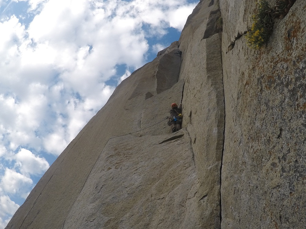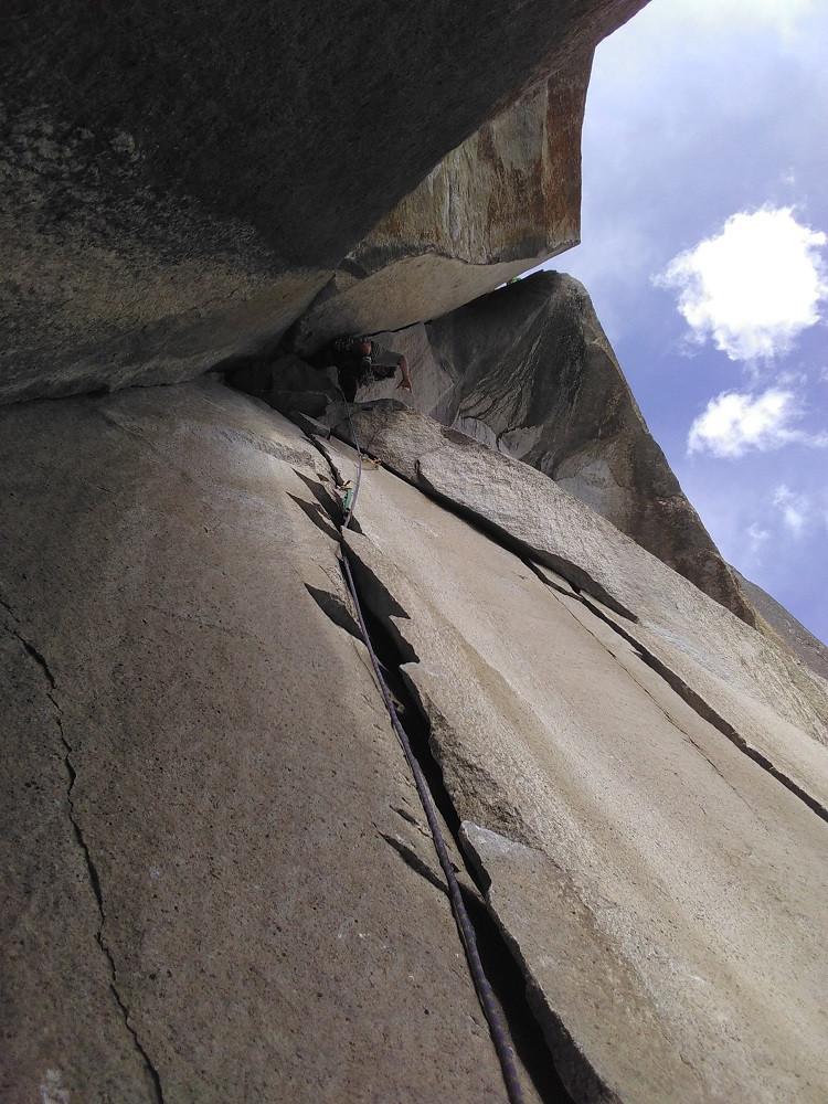Yo como siempre estaba ansioso y con ganas de darlo todo, pero este sentimiento se fue disipando mientras caminábamos y también un tanto debido al frio de la mañana; ya en la base de la pared me comencé a equipar, el primer bloque de siete largos me correspondía escalarlo a mi….. cuando me separé del piso supe que la única salida era la cumbre (ya que no teníamos forma de rapelear) esto suena peor de lo que en realidad es, he aquí lo divertido de la escalada, ir a la aventura. Escalaba lo más rápidamente posible, no podía ver más allá de la luz de mi frontal, así que tampoco sabía muy bien donde estaba; la experiencia era única, el primer largo paso en un parpadeo, el segundo y el tercero también, dentro de poco ya había pasado Sickle Ledge, aplicaba todos los trucos aprendidos durante las pasadas tres semanas como short fixing y lowers, también habían cosas que no sabía y en ese momento se tenía que improvisar.
