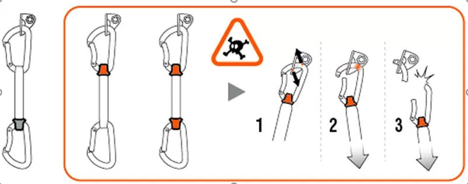 Donde el mosquetón que va a la chapa a tenido cinta que impide el libre movimiento. por lo general lo utilizan para que este no se gire y quede invertido. Lo que sugerimos es respetar el diseño de la cinta y utilizar los distintos sistemas para sujetar el mosquetón del lado que va a la cuerda.