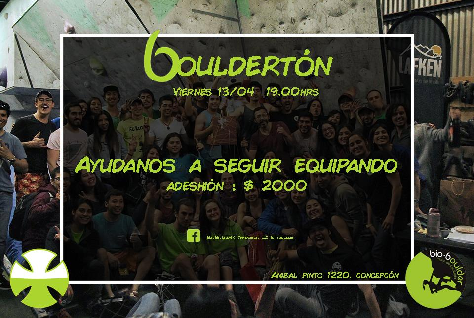 Tenemos el agrado de invitarles a la primera Boulderton en la sala de escalada Bioboulder de Concepción, con el fin de juntar recursos para comprar gran parte del equipo para abrir vías en roca, el cual ha sido perdido o robado. Este equipo es bastante caro y muy difícil de comprar para una sola persona, por eso queremos invitarlos a esta iniciativa y así poder seguir desarrollando las paredes de roca y contribuyendo con la escalada nacional.