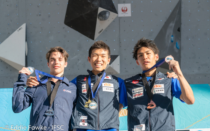 Esta es la segunda victoria de Sugimoto, que ganó el oro por última vez en 2013. Bailey quedó en segundo lugar en su primera medalla de la Copa del Mundo IFSC, completando dos bloques en un intento menos que Narasaki. El líder de la temporada, Jernej Kruder, de Eslovenia, quedó en cuarto lugar.