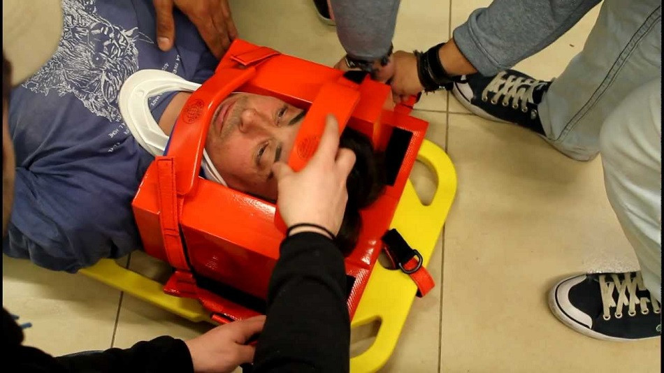 • La inmovilización cervical, restringiendo muy especialmente el movimiento lateral y antero–posterior del cuello, lo que se consigue improvisando topes a ambos lados del cuello y cabeza unidos con una cinta de dedos en la frente.