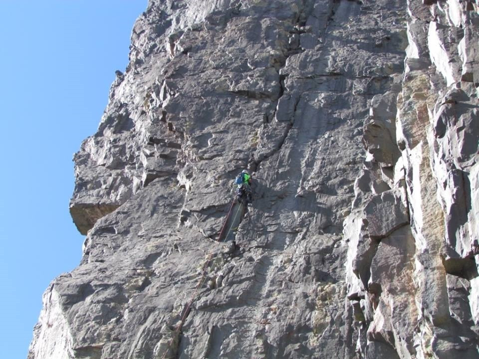 Junto con Diego Señoret, Giannina Murua y Alexis Rojas empezamos escalando, dejando reuniones fijas y pasadas con chapas y el resultado fue “Alerta Guerrilla” 850m. 5.10, 511+. 18 largos de todo tipo, fisuras, placas, diedros. La parte final va por pleno filo izquierdo haciendo la escalada muy escénica y vertical.
