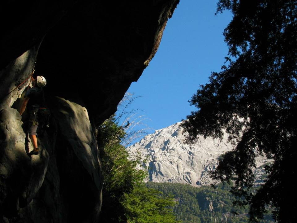 Foto: Abraham Navia escalando en Cochamó con el Trinidad de fondo