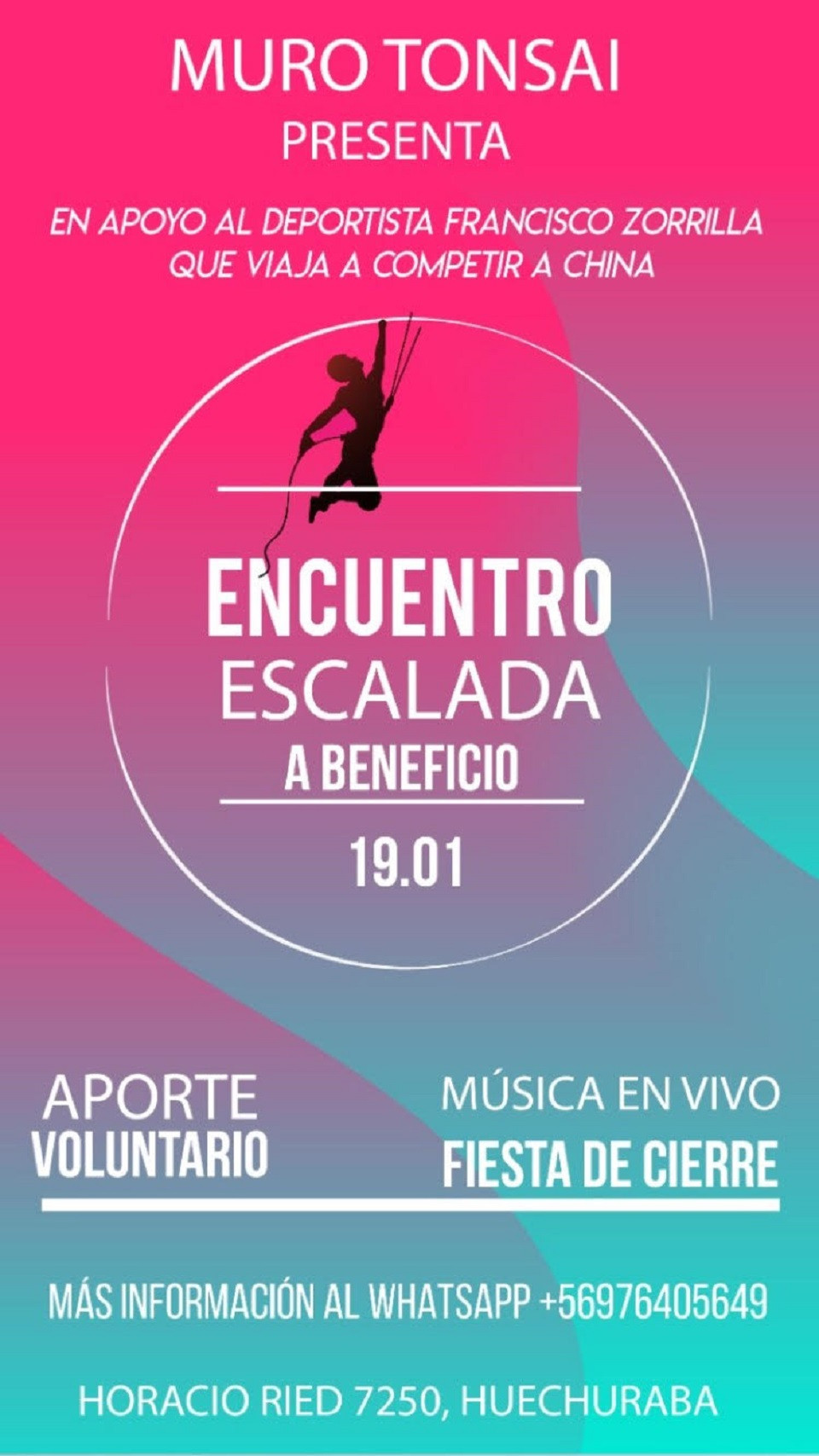Luchito Birkner moviéndose no solo en Tonsai, su muro de escalada, sino que también por el bien común y los amigos, como en este caso entregando su granito de arena para que un deportista pueda ir a china.El evento contará con diferentes actividades como: