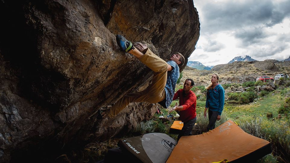 Keko Quiroga «spoteando» a Facu Lanbhen. Keko es uno de los grandes exponentes del boulder de nuestro país y siempre incentivando a los escaladores a limpiar y cepillar los agarres. Foto: Colección Facundo Langbhen