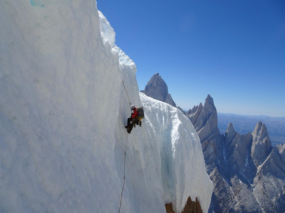 Fito rapeleando y disfrutando de unas vistas realmente alucinantes de las cumbres Patagonicas