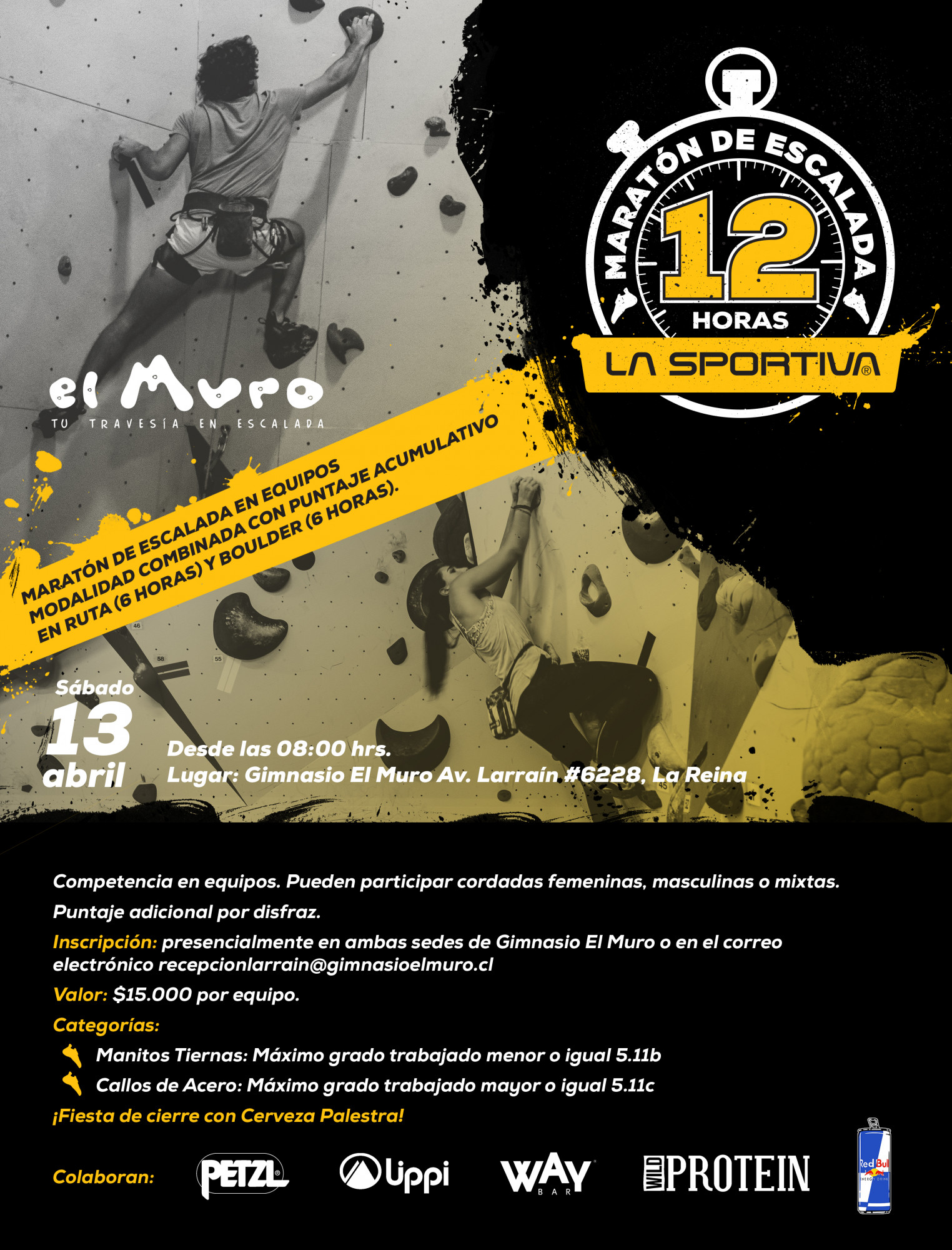 El próximo sábado 13 de abril a partir de las 08:00 horas se realizará la maratón de escalada “La Sportiva 12 horas” en las dependencias del Gimnasio El Muro de Av. Larraín 6228.