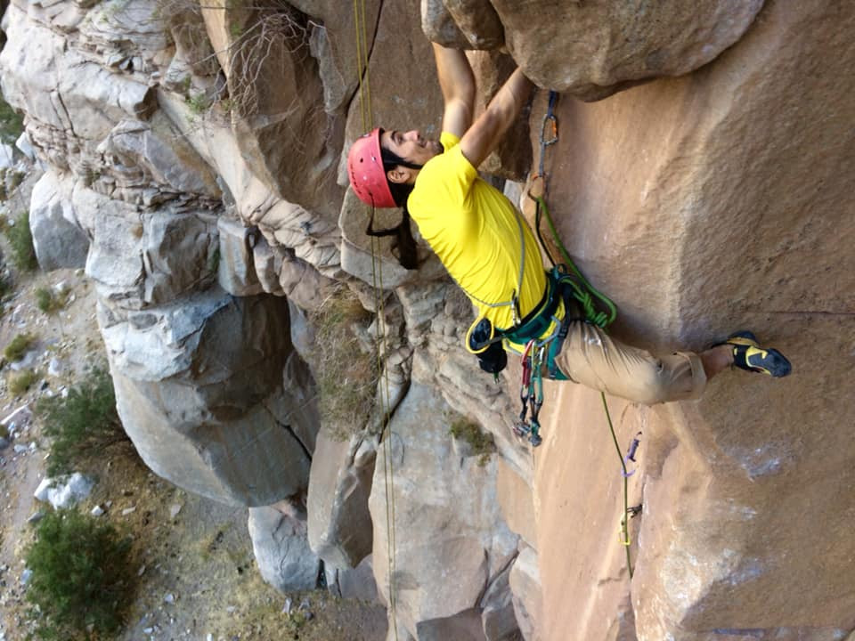 La escalada tradicional en el Alfalfal sería uno de los destinos que quedarían protegidos. En la foto Antoine Hernandez taloneando para no caer. Foto: Alexis Rojas.
