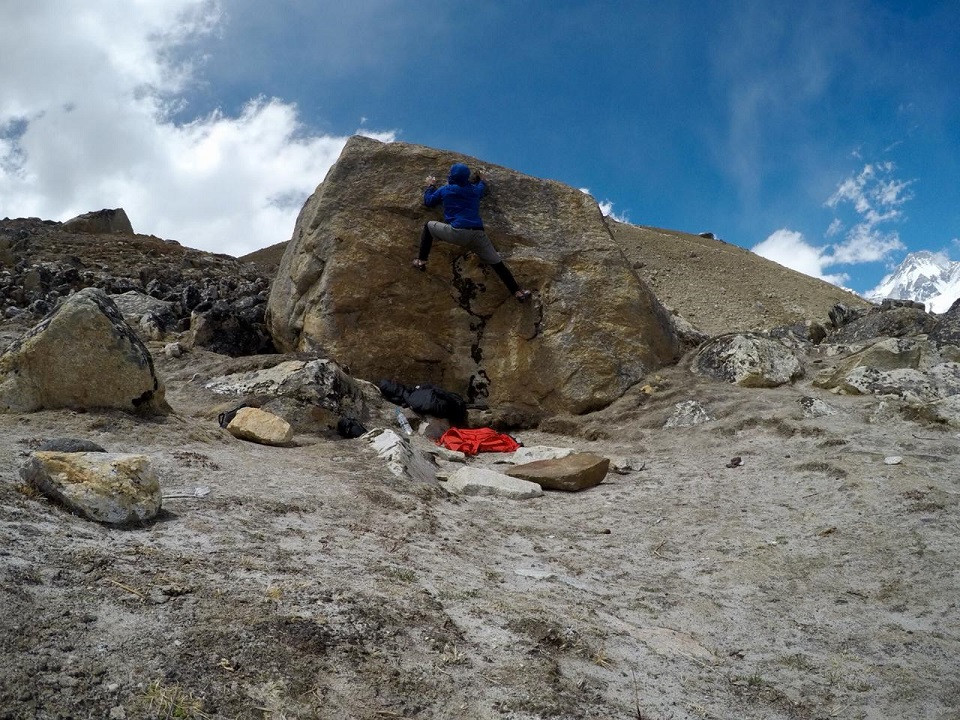 Dejando las yemas en la roca en otro boulder en las cercanias de Gorashep.