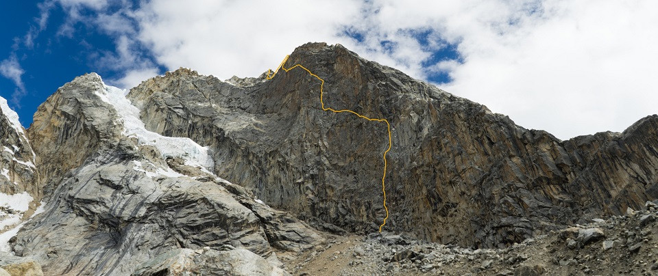 Un nevado famoso, y cercano a la capital andina de Huaraz, que nunca había sido ascendido por esta vertiente dada su compleja dificultad técnica. El trío recibe la información de la existencia de este objetivo, de los madrileños Carlos Cabeza y José Carlos Gómez Menor, que habían abierto hace unos años un espolón de roca cercano. La pared es impresionante, de roca granítica de máxima calidad, y la ruta que trazan para surcarla, busca los puntos más flacos que permiten superar con mucha visión, una pared técnicamente muy difícil que en varias ocasiones alcanza el 7º grado. Les cuesta dos días enteros llegar a la cumbre, durmiendo en la mitad de la pared, en una pequeña repisa en la que apenas caben los tres, y en la que hay tan poco espacio que no queda otro remedio que dejar los pies suspendidos del vacío… ”La noche fue terrible, de lo peor que recuerdo. No teníamos espacio para todos, nos resbalábamos para abajo, era imposible coger postura, y menos mal que nos llevamos dos sacos de The North Face, que unidos, nos permitían taparnos mínimamente. Las horas pasaron lentas, y a las 6 de la mañana, cuando empezó a amanecer, ya estábamos dispuestos para salir corriendo de allí” relata Iker todavía emocionado.